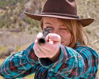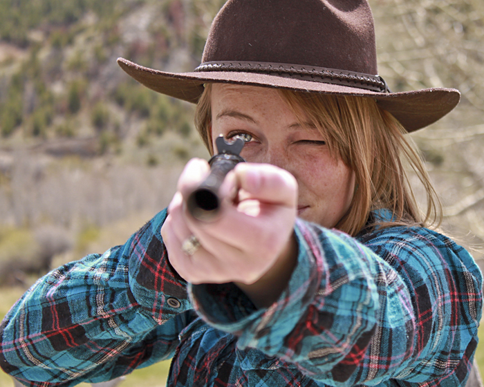 I asked Sarah to point the gun at me and then took two photos. I used the same settings for each photo, but the first one I focused on her hand and the gun. The second I focused on her face so that her hand was blurry. I edited both in Camera Raw: I lightened, added contrast, sharpened, bumped up the vibrance and exposure.